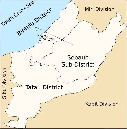 Since 1978 the town of Bintulu has been administered by the Bintulu Development Authority (BDA), with offices located along Jalan Tanjung Kidurong.[47] The town is located within the boundary of Bintulu District, with a population of 183,402[6] and a total area of 7,220.40 square kilometres (2,787.81 sq mi).[48] Bintulu Division was formerly a Bintulu District under the jurisdiction of Miri Division. The former Bintulu District was upgraded to Bintulu Division on 1 January 1987. At the same time, Bintulu sub-district was upgraded to the present-day Bintulu District.[30] Both the Bintulu Resident and District offices are located inside Wisma Residen, Pisang Keling Street, Bintulu.[49][50]