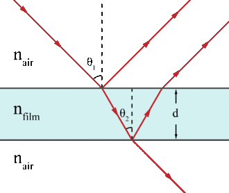 Bio-layer interferometry measures kinetics and biomolecular interactions on a basis of wave interference. To prepare for BLI analysis between two unique biomolecules, the ligand is first immobilized onto a bio compatible biosensor while the analyte is in solution.[5] Shortly after this, the biosensor tip is dipped into the solution and the target molecule will begin to associate with the analyte, producing a layer on top of the biosensor tip. This creates two separate surfaces: the substrate itself, and the substrate interacting with the molecule immobilized on the biosensor tip.[1] This essentially creates a thin-film interference, in which the created layer acts as a thin film bound by these two surfaces. White light from a tungsten lamp is shone onto the biosensor tip and reflected off both surfaces, creating two unique reflection patterns with different intensities.[5] Figure 2 expresses this phenomenon in a more general form. The wavelength shift (Δλ) between these two reflection patterns creates an interference pattern (Figure 3) from which all desired results can be obtained.[1] Since the wavelength shift is direct measure of the change in thickness of the biological layer and the biological layer thickness will change in response to molecules associating to and dissociating from the biosensor, the interference pattern will allow for real-time monitoring of molecular interactions on the biosensor surface.[6] In short, a positive wavelength shift implies an increase in biolayer thickness and thus more association, while a negative wavelength shift implies a decrease in biolayer thickness and thus more dissociation.[6]