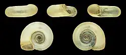 The shell of this species, like all planorbids is sinistral in coiling, but is carried upside down and thus appears to be dextral.