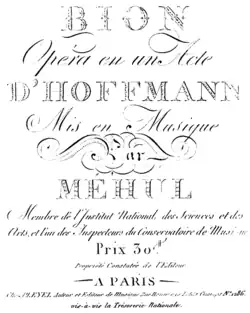 Bion is an opera by the French composer Étienne Méhul. It takes the form of a comédie en vers mêlée de musique (an opéra comique) in one act. It premiered at the Opéra-Comique in Paris on 27 December 1800.[1] The libretto, by François-Benoît Hoffman, is based on Les voyages d'Anténor by Étienne-François de Lantier. The opera was revived on 15 November 1802.[2]