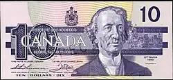 The prime minister featured on the $10 banknote obverse is John A. Macdonald, whose portrait was engraved by Thomas Hipschen of the Bureau of Engraving and Printing in the United States.[22] Adjacent to the portrait is a vignette of the buildings of Parliament as they were during his premiership, flying the Canadian Red Ensign.[22] The bird featured on the reverse is an osprey.[11] The purple banknote was introduced on 27 June 1989 and withdrawn on 17 January 2001.[23]