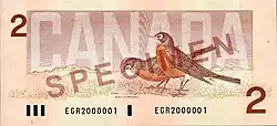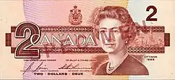 The $2 banknote has an obverse featuring Elizabeth II, the Queen of Canada at the time of its introduction on 2 September 1986.[16][3] A photograph by Anthony Buckley was the basis of the portrait, which was engraved by Henry S. Doubtfire of De La Rue.[17] Adjacent to the portrait is a vignette of the Parliament buildings.[17] The reverse of the terra cotta banknote features American robins.[3] This note would be the last Canadian $2 banknote, as the government announced during the 1995 Canadian federal budget speech that it would be withdrawn from circulation.[18] It was withdrawn on 16 February 1996 and was replaced by a $2 coin, colloquially referred to as the toonie.[2]