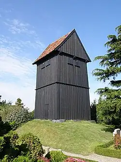 The wooden bell tower which stands apart from the church near the main entrance to the churchyard is the best preserved example of its kind in Denmark's country churches and one of the finest Medieval timber structures still standing in Denmark and possibly the oldest. Built on the top of an ancient burial mound, it consists of a heavy framework of oak on a fieldstone foundation.[3] The exterior covering of tarred planks has been replaced several times over the years, most recently in 1974.[2][4] It was one of the bell towers studied when the open-air museum Middelaldercentret on western Lolland build a bell tower in 2009.[5]