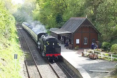 There was no station here until the Scottish Railway Preservation Society took over the branch line. The parts of the building were recovered from Monifieth railway station and were originally rebuilt in 1988 by Central Regional Council as their display at the Glasgow Garden Festival. When this closed the building was relocated to Birkhill. The summit of the line, located to the south of the station, was regraded and lowered to avoid the new platform being on an excessive gradient, and the station was opened to passengers in 1989.[2] The station was the limit of regular train operations from Bo'ness until 2010 when the services were extended to Manuel. The adjacent Birkhill Fireclay Mine is in the Bo'ness area and an integral part of the town's history but the Fireclay mine closed in 2013. There is a station building. which houses a shop, a cafe, and the former access the Birkhill Fireclay Mine.