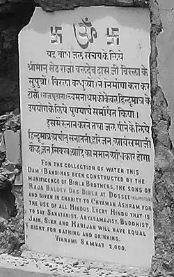 Baldeo Das, as well as his sons, were among the key supporters of the Swaraj movement led by Mahatma Gandhi, in addition to being dedicated Hindu activists. They were active supporters of the Banaras Hindu University founded by Pt. Madan Mohan Malaviya and were also financial supporters of activities initiated by Mahatma Gandhi.[15] The landmark Laxminarayan Temple in Delhi was built by Jugal Kishore Birla and was inaugurated by Mahatma Gandhi and as asked by Mahatma, all Hindus, including Harijans were welcomed in this temple.