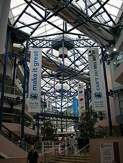 The façade of the building is covered in blue-tinted windows and white stone cladding. The entrance is adorned by a neon sculpture, by Ron Hasledon, named "Birdlife" which hangs above it.[5] The entrance is used as a small performance area and small protests are sometimes held there. The south side of the building features a link bridge to the Hyatt Regency Hotel. When the pre-fabricated connecting bridge was delivered, it was found to be too short, as the plans for the hotel had been modified, moving it away from the ICC slightly, but the bridge makers had not been informed.