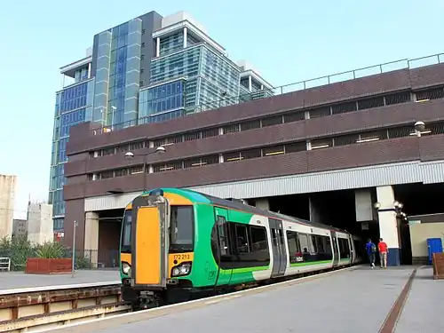 The first phase was completed on 5 October 1987, when the newly rebuilt Snow Hill station opened for services to the south, along with Snow Hill tunnel. The rebuilt station is on a smaller scale than its Edwardian predecessor, built with two island platforms, giving four platform faces. The station's architecture is functional rather than ornate, a multi-storey car park stands over the main platform area, meaning artificial lighting is required on the platforms. Like its predecessor, the main entrance is on Colmore Row. Some parts of the original station are still visible (notably the now-sealed entrance, with GWR crest, in Livery Street).[19]
