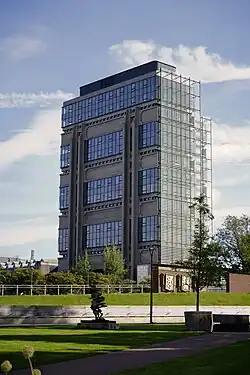 Arup Associates returned in the 1960s to design the Arts and Commerce Building, better known as Muirhead Tower and houses the Institute of Local Government Studies. This was completed in 1969.[25] A£42 million refurbishment of the 16-storey tower was completed in 2009 and it now houses the Colleges of Social Sciences and the Cadbury Research Library, the new home for the university's Special Collections. The podium was remodeled around the existing Allardyce Nicol studio theatre, providing additional rehearsal spaces and changing and technical facilities. The ground floor lobby now incorporates a Starbucks coffee shop.[67] The name, Muirhead Tower, came from that of the first philosophy professor of the university John Henry Muirhead.[67][68][69]