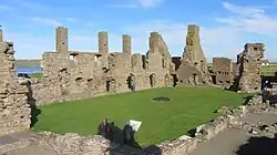 The late 16th-century palace was built by Robert Stewart, 1st Earl of Orkney (1533–93). Though extensively ruined, it can be seen to have consisted of four ranges round an open courtyard, with small towers at the corners, an unusual form of building in Scotland at this date, and unprecedented in the north of the country. The date 1574 was formerly carved above the main (south-facing) entrance. The building has been uninhabited since the late 17th century. It was originally adjoined by walled garden enclosures, an archery range and a bowling green. This building, along with the Earl's Palace, Kirkwall and Scalloway Castle in Shetland (all Historic Scotland), were the main residences of the Stewart Earls of Orkney in the Northern Isles.