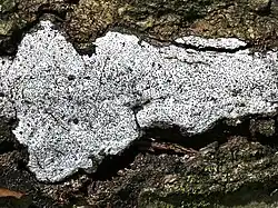 Patches of the fungus can reach a few metres across. It is white, sometimes with black patches, and usually with a black margin.[5]