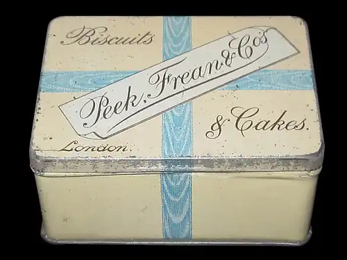 Biscuit tins are utilitarian or decorative containers used to package and sell biscuits (such as those served during tea) and some confectionery. Invented by Huntley & Palmers in 1831,[1] they are commonly found in households in United Kingdom, Ireland, and Commonwealth countries,[2] but also in continental Europe and French Canada. Popularity in the United States and English Canada spread later in the 20th century. Over 60% of UK households own a biscuit tin.[3]