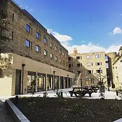 The college commenced the largest building project in its history when it demolished old Jevon's House, a "property of advanced decrepitude" once occupied by the bare-knuckle boxer and politician John Gully before its purchase by the university.[40][41] As parts of the building had become dangerous by this point, the entire structure had to be removed.[41] Construction of the new modernist style Jevons Building, which would complete the new Dunham Court, began in June 1966. It was officially unveiled in a ceremony in June 1968, attended by both Kingsley Dunham and Lord Lieutenant of Durham James Duff.[42] It won a Civic Trust Award the following year.[42] In 1972 a fishpond, since removed, was constructed in the centre of the court at the encouragement of senior college officers.[43]