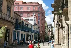 The Obispo Street (Spanish: Calle Obispo) is one of the most famous and traveled streets of Old Havana.[1] During its history, the street has received several names such as: San Juan, Bishop (Obispo), Weyler, Pi Margall, among others, for a total of 47. It is the longest Street in Old Havana. Street shops have always been abundant alongside O'Reilly Street, which is parallel to it from its inception from Zulueta to Havana Bay.