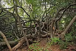 Top, the historic Bishopscourt residence of Anglican archbishop. Bottom left, Kirstenbosch Botanical Gardens is located to the immediate west of Bishopscourt. Bottom right, remaining part of Van Riebeeck's Hedge that used to run through the area. | |