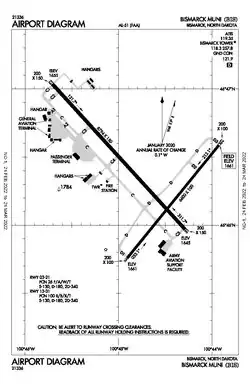 - ^ "Bismarck Municipal (BIS)". Airport Directory. North Dakota Aeronautics Commission. Retrieved August 13, 2013.