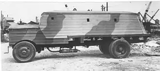 These were emphatically not "armoured cars", but merely a pillbox that could be moved from place to place. It was claimed to travel "at normal lorry speed"[4] but in practice it was mainly restricted to the flatness of airfields. Most had difficulty moving at all owing to their excess weight, poor visibility and reduced radiator cooling. Some broke down completely and were either towed, or abandoned in place. Those built on steam wagon chassis coped well with the extra weight once boilers were removed, but were no longer powered.