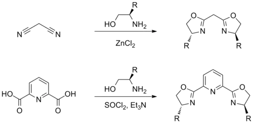 Part of the success of the BOX and PyBOX motifs lies in their convenient one step synthesis from malononitrile and dipicolinic acid, which are commercially available at low expense. Chirality is introduced with the amino alcohols, as these are prepared from amino acids and hence are chiral (e.g. valinol).