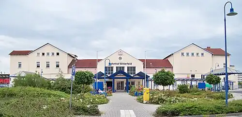 Bitterfeld station is a station in the town of Bitterfeld in the German state of Saxony-Anhalt. In 1857 the station was opened with the Trebnitz–Leipzig railway. Since the full commissioning of the line from Berlin to Halle, both lines have crossed in Bitterfeld. Subsequently, the line to Stumsdorf was also opened. Today, Bitterfeld is a long-distance station, which is served at two-hour intervals by ICEs from Berlin to Munich.