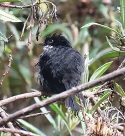 The black-backed bush tanager was formally described in 1885 by Władysław Taczanowski and Hans von Berlepsch from specimens collected by the Polish zoologist Jan Sztolcman (sometimes written Jean Stolzmann) on the eastern slopes of the Tungurahua Volcano in central Ecuador. The ornithologists introduced the monospecific genus Urothraupis and coined the binomial name Urothraupis stolzmanni.[2][3] The genus name combines the Ancient Greek oura meaning "tail" with thraupis, an unidentified small bird, used by ornithologist for tanagers. The specific epithet honors the collector Sztolcman/Stolzmann.[4] A 2014 molecular phylogenetic study of the tanager family Thraupidae found that the black-backed bush tanager is a member of the subfamily Poospizinae and has a sister relationship to the pardusco in the monospecific genus Nephelornis.[5] The black-backed bush tanager is monotypic: no subspecies are recognised.[6]