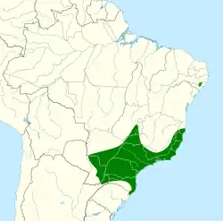 The black-capped screech owl is found in southeastern Brazil, southeastern Paraguay, and extreme northeastern Argentina. It inhabits a variety of landscapes, especially lowland rainforest and including forest with thick undergrowth, edges, open woodland, and secondary forest. In the northern part of its range it is found from sea level to at least 600 m (2,000 ft) but in the south only to 300 m (980 ft)[4]