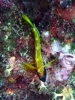 The common name yellow black-faced blenny derives from the colouration of territorial males during the breeding season: their body becomes yellow and their head turns black; during a territorial fight the colouration of the head changes to a grey colour as a sign of aggression.[3] Non-territorial males, females, and juveniles are cryptically coloured and are grey-brown with five dark and broad dorso-ventral bands between the head and the tail.[2][3][4] Outside the breading season, males and females can only be told apart with certainty by dissection.[3]
