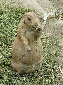 The black-tailed prairie dog (Cynomys ludovicianus) is a rodent of the family Sciuridae (the squirrels) found in the Great Plains of North America from about the United States–Canada border to the United States–Mexico border.[3] Unlike some other prairie dogs, these animals do not truly hibernate. The black-tailed prairie dog can be seen above ground in midwinter. A black-tailed prairie dog town in Texas was reported to cover 25,000 sq mi (64,000 km2) and included 400,000,000 individuals.[4] Prior to habitat destruction, the species may have been the most abundant prairie dog in central North America. It was one of two prairie dogs described by the Lewis and Clark Expedition in the journals and diaries of their expedition.