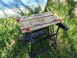 The Black & Decker Workmate is a general purpose portable workbench and general carpentry tool manufactured under the brand Black & Decker. It is a folding table for portability, but when unfolded stands about 3 feet (1 m) tall. The table top consists of two wooden jaws, one of which is fixed and the other moveable on threaded rods operated by handles. It can be used as a bench vice to hold wood, metal and other parts, either clamped between the jaws or, using supplied bench dogs, clamped on the table top. The jaws are wide enough to hold most bench top tools, such as a drill press, planer, miter saw, etc.[1]