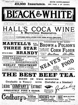Black & White magazine provided English readers with coverage of the Anglo-Boer War. It also published fiction by Henry James, Bram Stoker, H. G. Wells, Robert Barr, A. E. W. Mason, Jerome K. Jerome and E. Nesbit.[1] Others who wrote for Black and White included Samuel Bensusan, J. Keighley Snowden, Philip Howard Colomb, Nora Hopper, Henry Dawson Lowry, Robert Wilson Lynd, Theodore Bent, and Barry Pain. In its first year, Black and White published "A Straggler of '15'", a short story by Arthur Conan Doyle, and began serializing "The South Seas", a series of letters by Robert Louis Stevenson.[2] May Sinclair published her first short story, "A Study from Life", in the magazine in November 1895.[3] The periodical carried art by Harry Furniss, Mortimer Menpes, and Richard Caton Woodville; and photography by Horace Nicholls.[2]