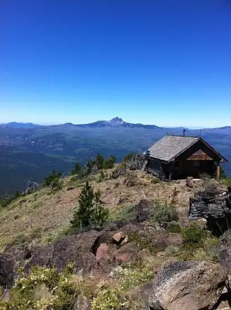 The butte had a fire lookout ground house,[41][42] which was built in 1979 out of wood,[43] though the butte has been used for fire detection since 1910.[30] Fire lookout staff used the station to cook and sleep before it was condemned in 2014 and burned down in 2016 by the United States Forest Service, who released a statement that it "was ineligible for preservation as a historical structure both in time and because of improvements made."[43] Lookouts still work at Black Butte during the fire season but use a yurt (a type of portable tent) instead.[43] There has been a white cupola structure on the top of the butte since 1923 and a more modern fire lookout tower, 62-foot (19 m) tall, which was built in 1995; neither are accessible to visitors.[30]
