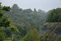 A dark seam of coal is clearly visible on the sides of Doultons Clay Pit, in Saltwells Wood to the south of Netherton