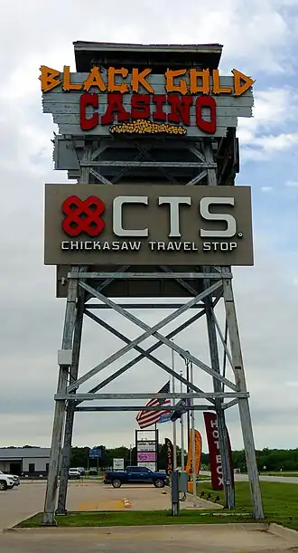 Black Gold Casino is a Native American gaming syndicate operated and owned by the Chickasaw Nation in the state of Oklahoma. The casino is adjacent to U.S. Route 70 in Oklahoma bearing due north of Wilson, Oklahoma within Oklahoma administrative division of Carter County.[1] The casino establishment offers provisions by the adjoining Chickasaw Travel Stop (CTS) providing travel necessities and a cultural native Chickasaw smokeshop.[2]