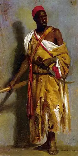 The Black Guard or ‘Abid al-Bukhari (Arabic: عبيد البخاري, lit. 'Slaves of al-Bukhārī'; also known as ‘Abīd ad-Dīwān "slaves of the diwan", Jaysh al-‘Abīd "the slave army", and ‘Abid as-Sultan "the sultan’s slaves")[1]: 162–163 were the corps of black-African slaves and Haratin slave-soldiers assembled by the 'Alawi sultan of Morocco, Isma‘il ibn Sharif (reigned 1672–1727).[2] They were called the "Slaves of Bukhari" because Sultan Isma‘il emphasized the importance of the teachings of the famous imam Muhammad al-Bukhari, going so far as to give the leaders of the army copies of his book.[3] This military corps, which was loyal only to the sultan, was one of the pillars of Isma'il's power as he sought to establish a more stable and more absolute authority over Morocco.[4]: 230–231