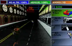 Players could walk, jump, run or call a taxicab hovercraft to navigate in the game's city.[4] During combat, players can either fight unarmed or with weapons that can auto-aim against enemy gangsters.[12] If the player shoots any kind of gun outside buildings, the police will respond immediately against the player but they can also be killed.[4] Players can also enter inside buildings and shops to talk with other non-player characters to be either hired for an assignment or buy new items, equipment and weapons.[4][12]