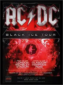 The Black Ice World Tour was a concert tour by the Australian rock band AC/DC, in support of their fifteenth studio album Black Ice, which was released on 20 October 2008.[2] This tour had 8 legs around the world lasting more than 20 months starting on 26 October 2008 in Wilkes-Barre, Pennsylvania and finishing on 28 June 2010 in Bilbao, Spain.