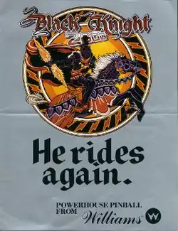 Black Knight 2000 is a 1989 pinball game designed by Steve Ritchie (who also provides the Knight's voice) and released by Williams Electronics. The game is the sequel to the 1980 pinball machine Black Knight. It was advertised with the slogan "He rides again." and features a black knight theme.[1] 30 years later, Ritchie would design a third game in the series for Stern Pinball, titled Black Knight: Sword of Rage.[2]