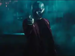 Later, a series of attacks by the Red Hood (revealed later as being a resurrected Jason Todd) causes Black Mask to lose power and money to this new rival.[15] The assassin Deathstroke later approaches Black Mask, offering him a place in the Society. Eager to strengthen his increasingly tenuous grip on the underworld, the crime lord accepts. However, the Red Hood eludes the Society's members and dismantles Black Mask's control over organized crime. Black Mask then continues to threaten the most important people in Catwoman's life, prompting her to kill him with her gun. After the shooting, Selina Kyle passes the mantle of Catwoman to her friend Holly, who is arrested for Sionis' murder. In Gotham Underground, dozens of would-be crime bosses attempt to fill the vacancy created by Black Mask's death.[16]