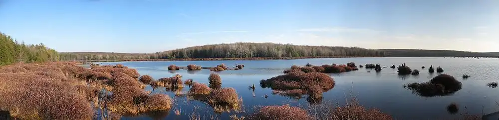 The bogs at the park contain large amounts of sphagnum moss; this decomposes very slowly, causing layers of dead moss to build up at the bottom of the bog, creating peat.[44] In 1994, 1,592 acres (644 ha) of bog at the state park were protected as the "Black Moshannon Bog Natural Area";[44] this was originally conceived as part of the State Parks 2000 strategic plan of the DCNR, and fourteen years later the total area of bog protected as a Natural Area had increased to 1,992 acres (806 ha).[45]