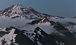 The history of the formation of the Cascade Mountains dates back millions of years ago to the late Eocene Epoch.[6] With the North American Plate overriding the Pacific Plate, episodes of volcanic igneous activity persisted.[6] Glacier Peak, a stratovolcano that is 5 mi (8.0 km) northeast of Black Mountain, began forming in the mid-Pleistocene.[1] In addition, small fragments of the oceanic and continental lithosphere called terranes created the North Cascades about 50 million years ago.[6]