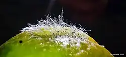The disease caused by this fungus occurs mainly on ripe fruits, such as strawberries, melon and peach, which are more susceptible to wounds and have a higher sugar content.[13] R. stolonifer can also cause soft rot of many vegetables, flowers, bulbs, corms, and seeds.[14] After a couple of days, the infected fruits become soft and release juices with an acidic odour.[13] When the humidity and temperature are favourable, the mycelial growth occurs rapidly at the surface of the infected fruit and the disease causes the development of long mycelial stolons with black sporangia and spores.[13] When the fungus germinates, it produces different kinds of esterases, including cutinase, which help the fungus to penetrate the plant cell wall.[13] Once spores germinate and puncture the cell wall, various enzymes are released to break down glucose, fructose, sucrose, and other sugars, producing fumaric acid, lactic acid, and ethanol.[15] The disease can also affect other adjacent healthy fruits when distributed by wind or insect activity.[4]