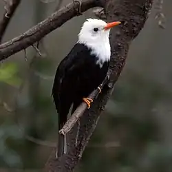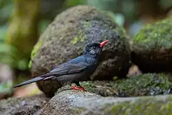 The black bulbul (Hypsipetes leucocephalus), also known as the Himalayan black bulbul or Asian black bulbul, is a member of the bulbul family of passerine birds. It is found primarily in the Himalayas, its range stretching from Pakistan eastward to Southeast Asia. It is the type species of the genus Hypsipetes, established by Nicholas Aylward Vigors in the early 1830s.[2] There are a number of subspecies, mostly varying in the shade of the body plumage which ranges from grey to black, and some also occur in white-headed morphs, as also suggested by its specific epithet leucocephalus, literally "white head". The legs and bill are always rich orange-red.