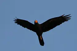 The black caracara (Daptrius ater) is a species of bird of prey in the family Falconidae found in Amazonian and French Guianan lowlands, occurring commonly along rivers. They are locally referred to as Ger' futu busikaka[2] in the Republic of Suriname, and juápipi {nẽjõmbʌ} by the Emberá of Panamá and Colombia. However, both of these names refer to multiple bird species within the Falconidae.[3] German-Brazilian ornithologist Helmut Sick also referred to this species as gavião-de-anta, literally translating to "tapir-hawk".[4]