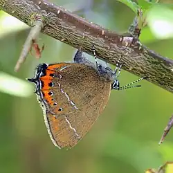 This small brown butterfly, wingspan about 37mm,[8] is very similar to the white-letter hairstreak but the black hairstreak has a row of orange spots along the edge of the upper-side hindwing. In the female these spots also extend to the forewings. The undersides are similar to the white-letter but the white line tends to be straighter and the orange border extends onto the forewings. The most conclusive way to distinguish the two is by the row of black spots accompanying the orange band which the white-letter hairstreak never has. They spend most of their lives in the canopy or in dense scrub, feeding on honeydew, and very rarely come down to ground level.