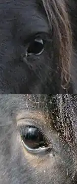 Black adult horses are easier to identify, as the coat must be entirely black, even if superficially sun bleached. A sun bleached black may be confused with a dark bay, but a trained eye can distinguish between them, particularly by examining the fine hairs around the eyes and muzzle. When a black horse is sun-bleached, the mane and tail often sun bleach most prominently, and the rest of the coat may have a rusty tinge. A sun-bleached black may also be mistaken as being smoky black, however their phenotypes overlap so there is no reliable way to identify them visually; some smoky black horses are solid black, and some regular black horses are heavily sun bleached.
