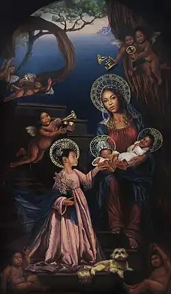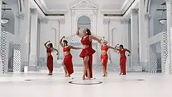 The film addresses and subverts stereotypical depictions of Africans and African Americans. Powerhouse Museum senior curator Roger Leong described how "tropes of African identity – the wild animal prints, the ultra, almost Josephine Baker images of the showgirl ... she draws on all these archetypes of black glamour and uses them as statements about black pride".[31] Costume designer Zerina Akers put the actors in designer animal print costumes, explaining how she "wanted to turn that [stereotype of Africans' primitive nature] on its head and raise it up to make it feel really high fashion".[32] Janell Hobson of Ms. stated that the "Mood 4 Eva" video is a satirical depiction of black regality and an inversion of classic film tropes, with the presence of white male servants acting as a reversal of the roles in films such as Gone with the Wind and The Help,[33] while Melanie McFarland for Salon wrote that a Busby Berkeley-inspired sequence in the video with black synchronized swimmers highlights how black people were excluded from Hollywood's Golden Age.[34] Natty Bakhita Kasambala of gal-dem wrote that Beyoncé filming scenes in settings such as a country house and renaissance supper table aims to "fill historically White Spaces with an unfiltered, unapologetic Blackness", an act which she calls "an extreme disturbance of the norm in order to shake the rigid structures loose altogether".[35]