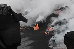 Black sand forming when lava hits ocean. Kīlauea volcano.