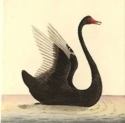 Governor Phillip, soon after establishing the convict settlement some sixty years later and 3,000 kilometres (1,900 mi) away at Botany Bay on the east coast, wrote in 1789 that "A black swan, which species, though proverbially rare in other parts of the world, is here by no means uncommon ... a very noble bird, larger than the common swan, and equally beautiful in form ... its wings were edged with white: the bill was tinged with red."[7] A contemporary, Surgeon-General John White, observed in 1790, "We found nine birds, that, whilst swimming, most perfectly resembled the rara avis of the ancients, a black swan."[7]
