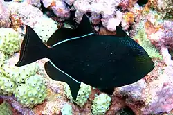 The black triggerfish or black durgon (Melichthys niger), called Humuhumu'ele'ele in Hawaiian, is a blimp-shaped triggerfish with bright white lines running along its dorsal and anal fins. From distance, it appears to be completely black. However, upon closer inspection with good lighting, one can see that it is actually mottled dark-blue/green coloration often with orange toward the front of the head. Black durgons are capable of changing color based on their surroundings.[1]