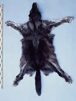 A black wolf is a melanistic colour variant of the gray wolf (Canis lupus).[1][2] Black specimens were recorded among red wolves (Canis rufus), though the colour phase in this species is not extinct yet.[3] Genetic research from the Stanford University School of Medicine and the University of California, Los Angeles revealed that wolves with black pelts owe their distinctive coloration to a mutation which occurred in domestic dogs, and was carried to wolves through wolf-dog hybridization.[1] Besides coat and knee colour, they are normal grey wolves.