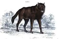 Linnaeus gave the black wolves of Europe the binomial name Canis lycaon, under the assumption that the species was distinct from grey- and white-coloured wolves. Cuvier and other naturalists largely followed his example.[4] Black wolves were considered rare in France, but common in Southern Europe at the time, with black wolf populations south to the Pyrenees apparently outnumbering other colour phases. They also occurred in the mountains of Friuli (Italy) and around Kotor (Montenegro). Black wolves were also reported in Siberia as the Vekvoturian Mountain-wolf.[5] Colonel Smith erroneously believed that the so-called "Rossomak" of the Lenas in Siberia was of the same variety.[6] However, in fact, "Rossomak" in Russian exactly corresponds with the English "wolverine", a mustelid species, in English (Gulo gulo in Latin). Black wolves were considered rare in northern Europe; however, Dr. Höggberg, a medical practitioner at Karlstad mentioned five black wolves being killed in the Swedish province of Värmland in 1801. These wolves were completely black and were bigger than the more common grey variety. Their pelts were considered exotic enough to be sold for three to four times the price established for more common colour phases.[7] Also, the last wolf in Scotland, supposedly killed by MacQueen of Pall à Chrocain, is usually narrated as having been black.[8] Cuvier noted that European black wolves differed little in size from other colour phases, but exceeded them in physical strength.[6] Charles Hamilton Smith wrote that black wolves were generally less aggressive than ordinary kinds, and interbred with dogs more readily.[5] In Serbia (Southeastern Europe, the Balkan Peninsula) indicated that on 17 November 2012, a black wolf was killed at Stara Mountain.[9][10] In Poland two black wolves, likely siblings, were caught on camera set up by SAVE Wildlife Conservation Fund crossing the forest river in northern Świętokrzyskie Voivodeship.[11][12][13]
