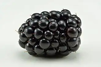 The usually black fruit is not a berry in the botanical sense, as it is termed botanically as an aggregate fruit, composed of small drupelets. It is a widespread and well-known group of over 375 species, many of which are closely related apomictic microspecies native throughout Europe, northwestern Africa, temperate western and central Asia and North and South America.[7]